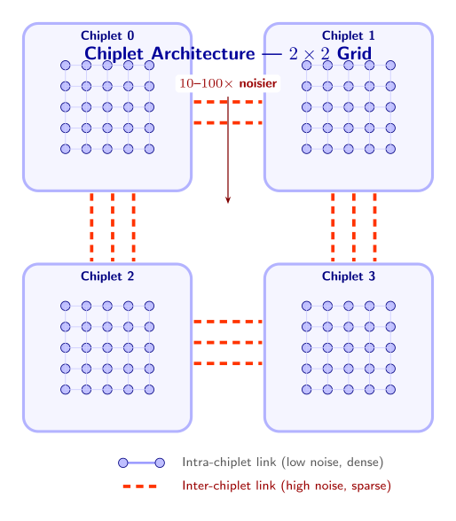 In a chiplet architecture, intra-chiplet qubit couplings are fast, low-noise, and dense. Inter-chiplet links — whether microwave couplers, bump bonds, or photonic interconnects — are typically 10–100x noisier than on-chip gates. A compiler that treats all connections as equivalent will happily route critical syndrome-extraction circuits over these noisy links, unaware that it is undermining the very error correction those circuits implement.