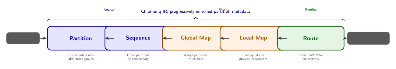 Each stage solves one sub-problem, and critically, the stages are compositional: the partitioner knows nothing about chiplets, the sequencer knows nothing about physical qubit coordinates, and the router receives a fully mapped circuit. This clean separation is what makes Chipmunq modular — you can swap out the partitioner without touching the router, or target a different backend by changing only the global and local mappers.