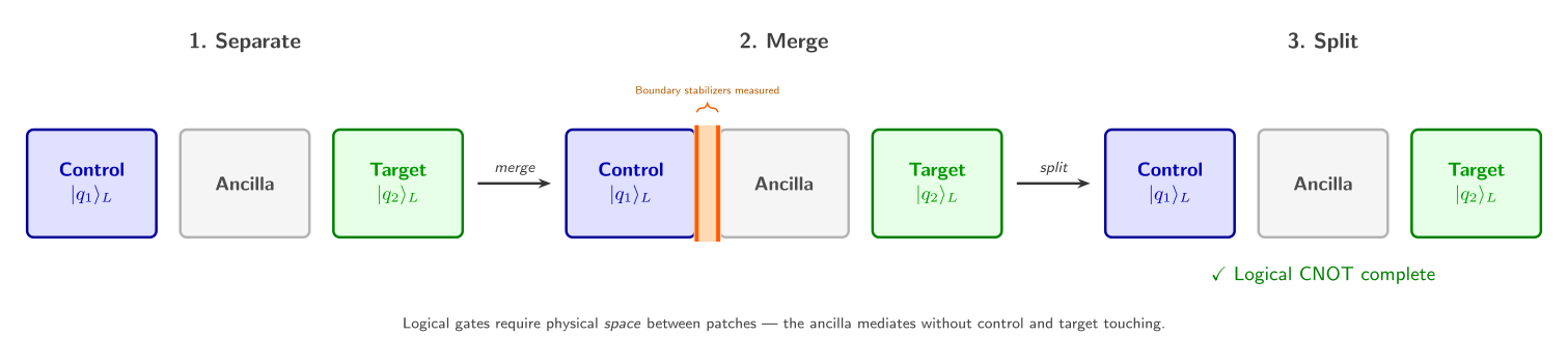 This is where lattice surgery comes in. Rather than physically moving qubits, we perform logical multi-qubit gates by merging adjacent patches (measuring stabilizers across their shared boundary) and then splitting them apart. A logical CNOT, for instance, requires three patches: two data patches (the control and target qubits) plus one ancilla patch that mediates the interaction. The merge-and-split sequence effectively performs a joint logical measurement, implementing the gate. Notice that this means every logical operation needs physical space between patches — a constraint that profoundly shapes how we lay out and route computations.