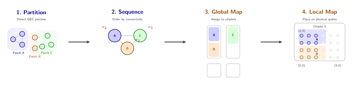 - Local map – Within each chiplet, logical qubits are placed onto physical qubits while preserving patch geometry.