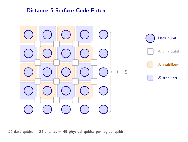 For instance, a distance-5 surface code patch is a \(5 \times 5\) grid of data qubits (25 total) plus 24 ancilla qubits for syndrome extraction, giving 49 physical qubits for one logical qubit. A logical CNOT via lattice surgery needs 3 such patches (control, target, and ancilla), totaling \(3 \times 49 = 147\) physical qubits minimum. At distance 15, that becomes \(3 \times 421 \approx 1{,}263\) physical qubits for a single logical CNOT.
