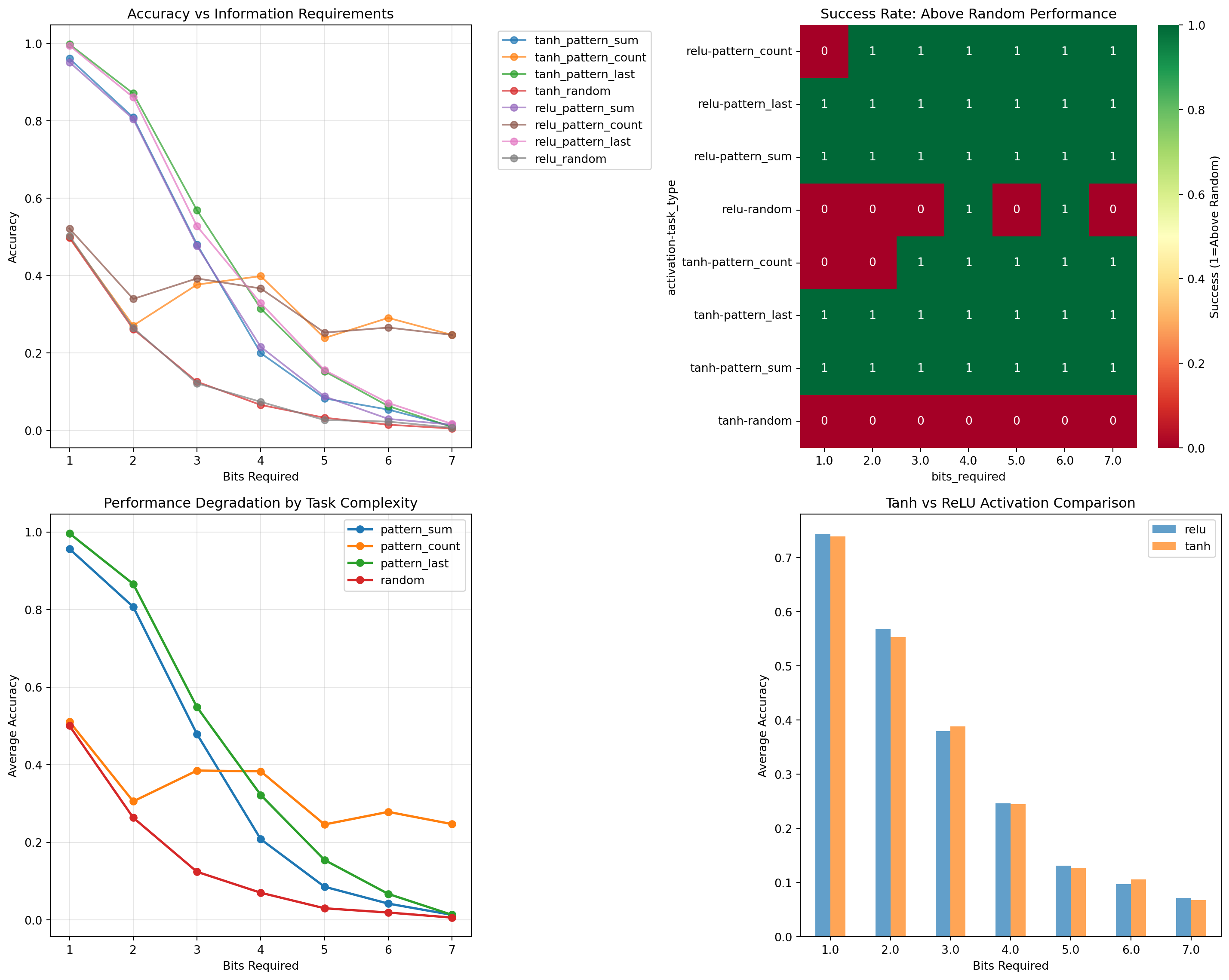 def generate_controlled_information_tasks():"""Generate tasks with precisely controlled information requirements""" tasks = {} n_samples =2000# Task series: State tracking with increasing complexity# Each task requires tracking N different statesfor n_states in [2, 4, 8, 16, 32]: # 1, 2, 3, 4, 5 bits seq_len =10# Generate sequences where we need to track which state we're in X = torch.zeros(n_samples, seq_len, 2) # [value, state_id] y = torch.zeros(n_samples).long()for i inrange(n_samples):# Random walk through states current_state =0 states_visited = []for t inrange(seq_len):# State transition signal in second channelif t >0and torch.rand(1) <0.3: # 30% chance to transition current_state = (current_state +1) % n_states X[i, t, 0] = torch.randn(1) # Random value (noise) X[i, t, 1] = current_state # State ID states_visited.append(current_state)# Task: predict the most common state visited unique_states, counts = torch.unique(torch.tensor(states_visited), return_counts=True) most_common_state = unique_states[torch.argmax(counts)] y[i] = most_common_state tasks[f'StateTrack_{n_states}'] = (X, y)# Task series: Multi-counter tracking# Requires maintaining multiple independent countersfor n_counters in [1, 2, 3, 4]: seq_len =12 X = torch.zeros(n_samples, seq_len, n_counters +1) # [counter_increments..., query] y = torch.zeros(n_samples).long()for i inrange(n_samples): counters = torch.zeros(n_counters)for t inrange(seq_len -1): # Last timestep is query# Random increments to different countersfor c inrange(n_counters):if torch.rand(1) <0.2: # 20% chance to increment each counter counters[c] +=1 X[i, t, c] =1# Signal increment# Final timestep: query which counter to report query_counter = torch.randint(0, n_counters, (1,)).item() X[i, -1, -1] = query_counter # Query signal y[i] =int(counters[query_counter]) # Answer# Convert to classification (low/medium/high counts) max_count = y.max()if max_count >0: y = (y / (max_count /3)).long().clamp(0, 2) # 3 classes tasks[f'MultiCounter_{n_counters}'] = (X, y)return tasksdef measure_information_bottleneck():"""Systematically measure where information bottleneck occurs"""# Cache file for experiment 4 cache_file ="experiment4_bottleneck_results.json"if os.path.exists(cache_file):print("Loading cached results from experiment 4...")withopen(cache_file, 'r') as f: cached_data = json.load(f)return pd.DataFrame(cached_data)print("Running experiment 4 (this may take a while)...") results = [] controlled_tasks = generate_controlled_information_tasks()# Test with different hidden sizes to see scaling hidden_sizes = [1, 2, 4, 8]for hidden_size in hidden_sizes:for task_name, (X, y) in controlled_tasks.items():# Extract task complexity infoif'StateTrack'in task_name: n_states =int(task_name.split('_')[1]) bits_required = np.log2(n_states) task_type ='StateTracking'else: # MultiCounter n_counters =int(task_name.split('_')[1]) bits_required = n_counters *3# Each counter needs ~3 bits task_type ='MultiCounter'# Split data train_size =int(0.8*len(X)) train_X, test_X = X[:train_size], X[train_size:] train_y, test_y = y[:train_size], y[train_size:] train_dataset = TensorDataset(train_X, train_y) test_dataset = TensorDataset(test_X, test_y) train_loader = DataLoader(train_dataset, batch_size=32, shuffle=True) test_loader = DataLoader(test_dataset, batch_size=32, shuffle=False)# Custom GRU for variable hidden sizesclass VariableGRU(nn.Module):def__init__(self, input_size, hidden_size, num_classes):super().__init__()self.gru = nn.GRU(input_size, hidden_size, batch_first=True)self.classifier = nn.Linear(hidden_size, num_classes)def forward(self, x): _, h =self.gru(x)returnself.classifier(h.squeeze(0))# Determine number of classes num_classes =len(torch.unique(y)) model = VariableGRU(X.shape[2], hidden_size, num_classes) accuracy = train_and_evaluate(model, train_loader, test_loader, epochs=150)# Random baseline random_baseline =1.0/ num_classes results.append({'hidden_size': hidden_size,'task_name': task_name,'task_type': task_type,'bits_required': bits_required,'accuracy': accuracy,'random_baseline': random_baseline,'success': accuracy > random_baseline *1.2, # 20% above random'num_classes': num_classes })print(f"H{hidden_size} | {task_name:15} | {bits_required:4.1f} bits | {accuracy:.3f}")# Save results to cachewithopen(cache_file, 'w') as f: json.dump(results, f)return pd.DataFrame(results)# Run information bottleneck experimentprint("Measuring information bottleneck limits...")bottleneck_results = measure_information_bottleneck()