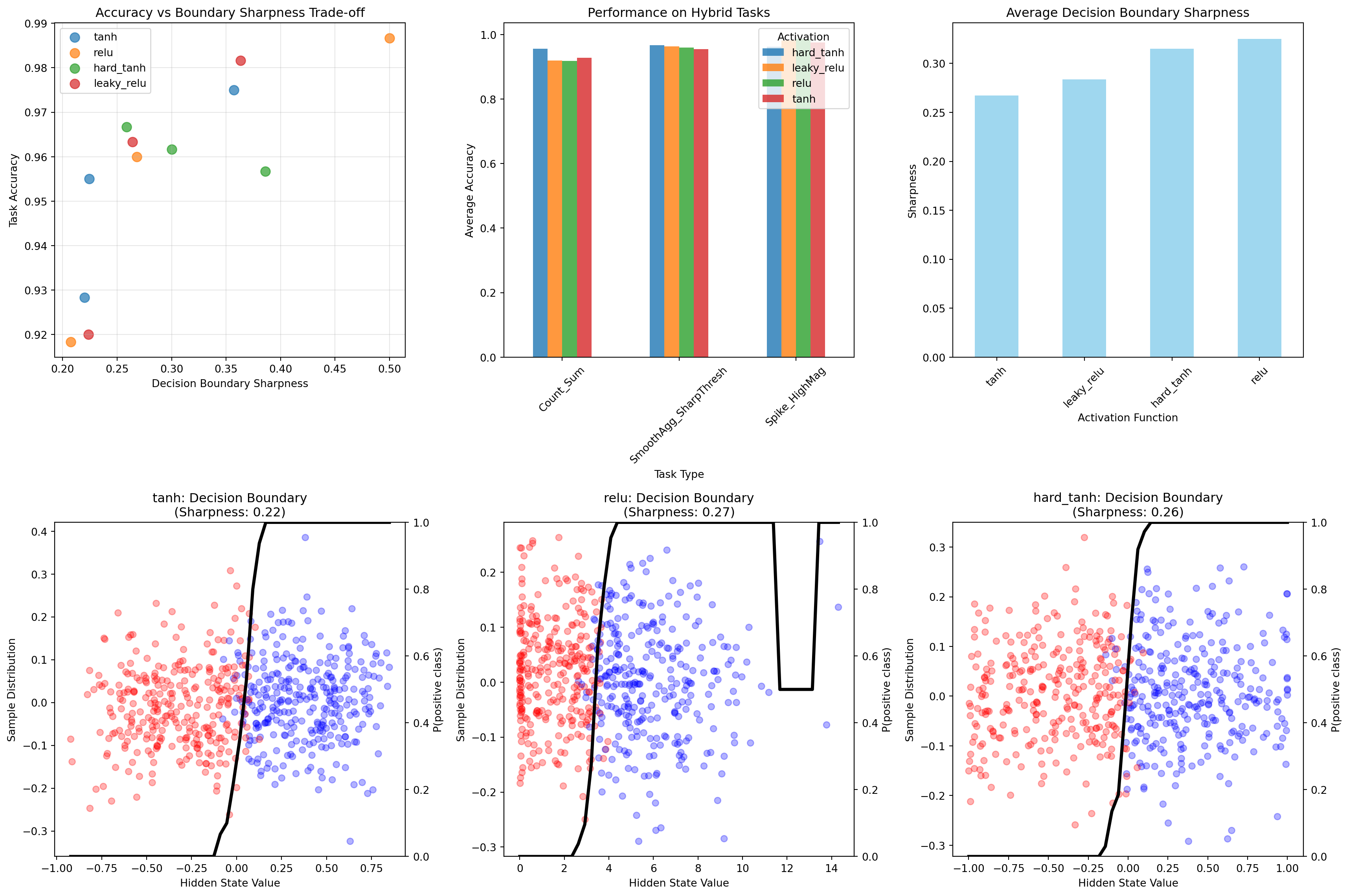 def generate_hybrid_tasks(n_samples, seq_len=8):"""Generate tasks requiring both smooth and sharp operations""" tasks = {}# Task 1: Smooth aggregation + Sharp threshold X_hybrid1 = torch.randn(n_samples, seq_len, 1)# Smooth: compute weighted average (emphasize later elements) weights = torch.linspace(0.1, 1.0, seq_len).unsqueeze(0).unsqueeze(2) weighted_avg = (X_hybrid1 * weights).sum(dim=1) / weights.sum()# Sharp: threshold at exactly 0 y_hybrid1 = (weighted_avg.squeeze() >0.0).long() tasks['SmoothAgg_SharpThresh'] = (X_hybrid1, y_hybrid1)# Task 2: Pattern detection + Magnitude estimation X_hybrid2 = torch.randn(n_samples, seq_len, 1) *2# Larger range# Sharp: detect if sequence contains value > 2.5 has_spike = (X_hybrid2 >2.5).any(dim=1).squeeze()# Smooth: average magnitude avg_magnitude = X_hybrid2.abs().mean(dim=1).squeeze()# Combined: spike detection AND high average magnitude y_hybrid2 = ((has_spike) & (avg_magnitude >1.0)).long() tasks['Spike_HighMag'] = (X_hybrid2, y_hybrid2)# Task 3: Counting + Interpolation X_hybrid3 = torch.randn(n_samples, seq_len, 1)# Sharp: count positive values pos_count = (X_hybrid3 >0).sum(dim=1).squeeze().float()# Smooth: sum of all values total_sum = X_hybrid3.sum(dim=1).squeeze()# Combined: high count AND high sum y_hybrid3 = ((pos_count >=4) & (total_sum >0)).long() tasks['Count_Sum'] = (X_hybrid3, y_hybrid3)return tasksdef analyze_decision_boundaries(model, task_data, task_name, resolution=50):"""Analyze how sharp/smooth the learned decision boundaries are""" X, y = task_data# Extract hidden states for visualization model.eval() hidden_states = [] labels = []with torch.no_grad():for i inrange(min(1000, len(X))): # Sample for speed x_sample = X[i].unsqueeze(0)# Get hidden state after processing sequence h = torch.zeros(1, 1)for t inrange(x_sample.shape[1]): x_t = x_sample[:, t, :] r_t = torch.sigmoid(model.W_ir(x_t) + model.W_hr(h)) z_t = torch.sigmoid(model.W_iz(x_t) + model.W_hz(h)) n_t = model.activation(model.W_in(x_t) + model.W_hn(r_t * h)) h = (1- z_t) * n_t + z_t * h hidden_states.append(h.item()) labels.append(y[i].item())# Analyze boundary sharpness h_array = np.array(hidden_states) y_array = np.array(labels)# Find decision boundary h_min, h_max = h_array.min(), h_array.max() h_range = np.linspace(h_min, h_max, resolution)# For each hidden state value, compute probability of positive class boundary_probs = []for h_val in h_range: nearby_indices = np.abs(h_array - h_val) < (h_max - h_min) / resolutionif nearby_indices.sum() >0: prob = y_array[nearby_indices].mean() boundary_probs.append(prob)else: boundary_probs.append(0.5) # Default# Compute sharpness: how quickly does probability change? prob_gradient = np.gradient(boundary_probs) max_gradient = np.abs(prob_gradient).max()return {'hidden_states': h_array,'labels': y_array,'h_range': h_range,'boundary_probs': np.array(boundary_probs),'sharpness': max_gradient,'task_name': task_name }def test_hybrid_tasks():"""Test performance on hybrid tasks requiring both smooth and sharp operations"""# Cache file for experiment 3 cache_file ="experiment3_hybrid_results.json" boundary_cache_file ="experiment3_boundary_data.json"if SKIP_TRAINING:print("SKIP_TRAINING is True - returning placeholder data for experiment 3") placeholder_results = [] placeholder_boundaries = [] activations = ['tanh', 'relu', 'hard_tanh', 'leaky_relu'] tasks = ['SmoothAgg_SharpThresh', 'Spike_HighMag', 'Count_Sum']for activation in activations:for task in tasks: acc =0.6+ np.random.random()*0.3 sharpness =2.0+ np.random.random()*3.0if activation in ['hard_tanh', 'relu'] else0.5+ np.random.random()*1.5 placeholder_results.append({'activation': activation, 'task_name': task, 'accuracy': acc, 'boundary_sharpness': sharpness })# Simple boundary analysis h_states = np.random.randn(100) labels = (h_states >0).astype(int) h_range = np.linspace(-2, 2, 50) boundary_probs =1/ (1+ np.exp(-h_range * sharpness)) # Sigmoid-like placeholder_boundaries.append({'activation': activation, 'task_name': task, 'hidden_states': h_states,'labels': labels, 'h_range': h_range, 'boundary_probs': boundary_probs, 'sharpness': sharpness })return pd.DataFrame(placeholder_results), placeholder_boundariesif os.path.exists(cache_file) and os.path.exists(boundary_cache_file):print("Loading cached results from experiment 3...")withopen(cache_file, 'r') as f: cached_results = json.load(f)withopen(boundary_cache_file, 'r') as f: cached_boundaries = json.load(f)# Convert boundary data back to proper format boundary_analyses = []for b in cached_boundaries: b['hidden_states'] = np.array(b['hidden_states']) b['labels'] = np.array(b['labels']) b['h_range'] = np.array(b['h_range']) b['boundary_probs'] = np.array(b['boundary_probs']) boundary_analyses.append(b)return pd.DataFrame(cached_results), boundary_analysesprint("Running experiment 3 (this may take a while)...") results = [] boundary_analyses = [] n_samples =3000# Generate hybrid tasks hybrid_tasks = generate_hybrid_tasks(n_samples)# Test different activations and architectures activations = ['tanh', 'relu', 'hard_tanh', 'leaky_relu']for activation in activations:for task_name, (X, y) in hybrid_tasks.items():# Split data train_size =int(0.8* n_samples) train_X, test_X = X[:train_size], X[train_size:] train_y, test_y = y[:train_size], y[train_size:] train_dataset = TensorDataset(train_X, train_y) test_dataset = TensorDataset(test_X, test_y) train_loader = DataLoader(train_dataset, batch_size=32, shuffle=True) test_loader = DataLoader(test_dataset, batch_size=32, shuffle=False)# Train model model = FlexibleGRU(1, 1, 2, activation) accuracy = train_and_evaluate(model, train_loader, test_loader, epochs=200)# Analyze decision boundary boundary_analysis = analyze_decision_boundaries(model, (test_X, test_y), task_name) boundary_analysis['activation'] = activation boundary_analyses.append(boundary_analysis) results.append({'activation': activation,'task_name': task_name,'accuracy': accuracy,'boundary_sharpness': boundary_analy
