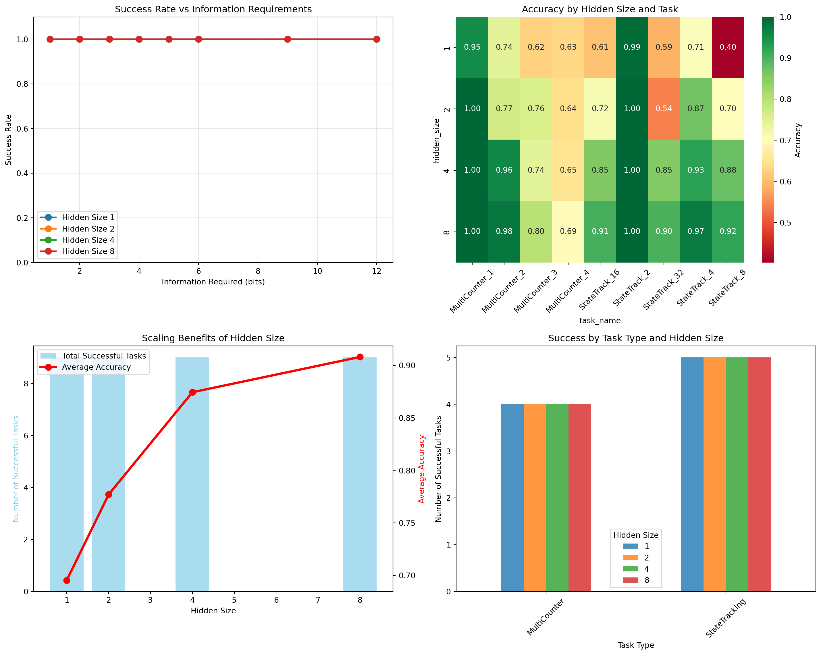 # Analyze bottleneck resultsfig, axes = plt.subplots(2, 2, figsize=(15, 12))# Plot 1: Success rate by bits required and hidden sizefor hidden_size insorted(bottleneck_results['hidden_size'].unique()): data = bottleneck_results[bottleneck_results['hidden_size'] == hidden_size] success_by_bits = data.groupby('bits_required')['success'].mean() axes[0, 0].plot(success_by_bits.index, success_by_bits.values, 'o-', label=f'Hidden Size {hidden_size}', linewidth=2, markersize=8)axes[0, 0].set_xlabel('Information Required (bits)')axes[0, 0].set_ylabel('Success Rate')axes[0, 0].set_title('Success Rate vs Information Requirements')axes[0, 0].legend()axes[0, 0].grid(True, alpha=0.3)axes[0, 0].set_ylim(0, 1.1)# Plot 2: Accuracy heatmap by hidden size and taskaccuracy_pivot = bottleneck_results.pivot_table( values='accuracy', index='hidden_size', columns='task_name', aggfunc='first')sns.heatmap(accuracy_pivot, annot=True, fmt='.2f', cmap='RdYlGn', ax=axes[0, 1], cbar_kws={'label': 'Accuracy'})axes[0, 1].set_title('Accuracy by Hidden Size and Task')axes[0, 1].tick_params(axis='x', rotation=45)# Plot 3: Hidden size scaling analysisscaling_analysis = bottleneck_results.groupby('hidden_size').agg({'success': 'sum','bits_required': 'max','accuracy': 'mean'}).reset_index()ax1 = axes[1, 0]ax2 = ax1.twinx()bars = ax1.bar(scaling_analysis['hidden_size'], scaling_analysis['success'], alpha=0.7, color='skyblue', label='Total Successful Tasks')line = ax2.plot(scaling_analysis['hidden_size'], scaling_analysis['accuracy'], 'ro-', linewidth=3, markersize=8, label='Average Accuracy')ax1.set_xlabel('Hidden Size')ax1.set_ylabel('Number of Successful Tasks', color='skyblue')ax2.set_ylabel('Average Accuracy', color='red')ax1.set_title('Scaling Benefits of Hidden Size')# Combined legendlines1, labels1 = ax1.get_legend_handles_labels()lines2, labels2 = ax2.get_legend_handles_labels()ax1.legend(lines1 + lines2, labels1 + labels2, loc='upper left')# Plot 4: Task type comparisontask_type_comparison = bottleneck_results.groupby(['task_type', 'hidden_size'])['success'].sum().unstack()task_type_comparison.plot(kind='bar', ax=axes[1, 1], alpha=0.8)axes[1, 1].set_title('Success by Task Type and Hidden Size')axes[1, 1].set_xlabel('Task Type')axes[1, 1].set_ylabel('Number of Successful Tasks')axes[1, 1].tick_params(axis='x', rotation=45)axes[1, 1].legend(title='Hidden Size')plt.tight_layout()plt.show()# Find the information capacity limitsprint("\nInformation Capacity Analysis:")for hidden_size insorted(bottleneck_results['hidden_size'].unique()): data = bottleneck_results[bottleneck_results['hidden_size'] == hidden_size] successful_tasks = data[data['success']]iflen(successful_tasks) >0: max_bits = successful_tasks['bits_required'].max() total_successful =len(successful_tasks)print(f"Hidden Size {hidden_size}: Max {max_bits:.1f} bits, {total_successful}/{len(data)} tasks successful")else:print(f"Hidden Size {hidden_size}: No successful tasks")