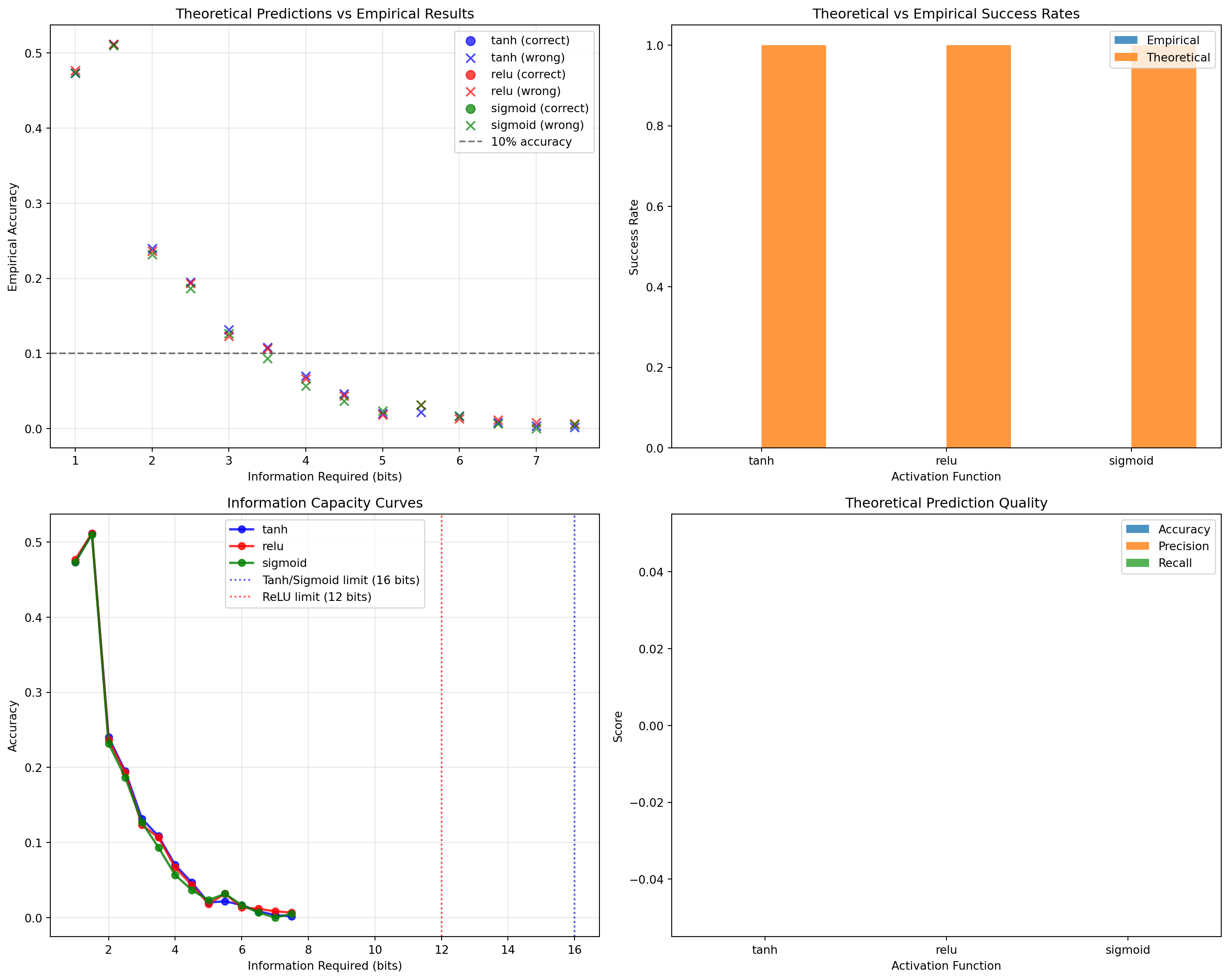 def theoretical_vs_empirical_analysis():"""Compare theoretical limits with empirical performance"""# Cache file for experiment 5 cache_file ="experiment5_theory_results.json"if os.path.exists(cache_file):print("Loading cached results from experiment 5...")withopen(cache_file, 'r') as f: cached_data = json.load(f)return pd.DataFrame(cached_data)print("Running experiment 5 (this may take a while)...") results = []# Test across a range of information requirementsfor bits in np.arange(1, 8, 0.5): # 1 to 7.5 bits in 0.5 increments num_classes =int(2**bits) n_samples =3000 seq_len =8# Generate random classification task X = torch.randn(n_samples, seq_len, 1) y = torch.randint(0, num_classes, (n_samples,))# Theoretical analysis shannon_entropy = bits # By construction theoretical_min_accuracy =1.0/ num_classes # Random baseline# Information density in hidden state# A single float can theoretically hold ~23 bits (IEEE 754)# But activation functions constrain the range significantly# Tanh: maps to [-1, 1], effective precision ~16 bits with normal gradients tanh_capacity =16 tanh_sufficient = bits <= tanh_capacity# Sigmoid: maps to [0, 1], similar constraints sigmoid_capacity =16 sigmoid_sufficient = bits <= sigmoid_capacity# ReLU: [0, inf), but gradient issues limit practical range relu_capacity =12# More conservative due to unbounded nature relu_sufficient = bits <= relu_capacity# Train actual models train_size =int(0.8* n_samples) train_X, test_X = X[:train_size], X[train_size:] train_y, test_y = y[:train_size], y[train_size:] train_dataset = TensorDataset(train_X, train_y) test_dataset = TensorDataset(test_X, test_y) train_loader = DataLoader(train_dataset, batch_size=64, shuffle=True) test_loader = DataLoader(test_dataset, batch_size=64, shuffle=False) empirical_results = {}for activation in ['tanh', 'relu', 'sigmoid']: model = SingleCellGRU(1, num_classes, activation) accuracy = train_and_evaluate(model, train_loader, test_loader, epochs=100) empirical_results[f'{activation}_accuracy'] =float(accuracy)# Check if significantly above random empirical_results[f'{activation}_success'] =bool(accuracy > theoretical_min_accuracy *1.5)# Theoretical predictions theoretical_predictions = {'tanh_predicted': bool(tanh_sufficient),'sigmoid_predicted': bool(sigmoid_sufficient),'relu_predicted': bool(relu_sufficient) } results.append({'bits_required': float(bits),'num_classes': int(num_classes),'shannon_entropy': float(shannon_entropy),'random_baseline': float(theoretical_min_accuracy),**empirical_results,**theoretical_predictions,'sample_efficiency': float(n_samples / num_classes) # Samples per class })print(f"{bits:4.1f} bits | {num_classes:3d} classes | "f"Tanh: {empirical_results['tanh_accuracy']:.3f} | "f"ReLU: {empirical_results['relu_accuracy']:.3f} | "f"Sigmoid: {empirical_results['sigmoid_accuracy']:.3f}")# Save results to cachewithopen(cache_file, 'w') as f: json.dump(results, f)return pd.DataFrame(results)# Run theoretical vs empirical comparisonprint("Comparing theoretical and empirical information limits...")theory_results = theoretical_vs_empirical_analysis()